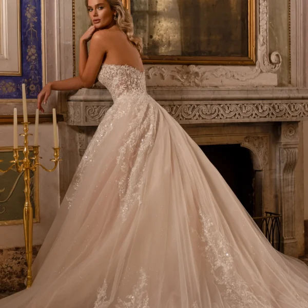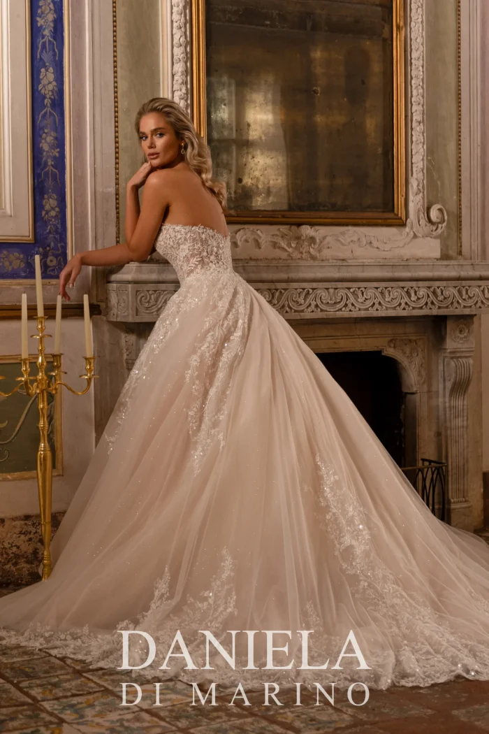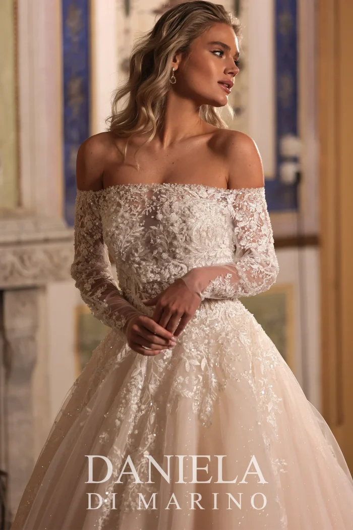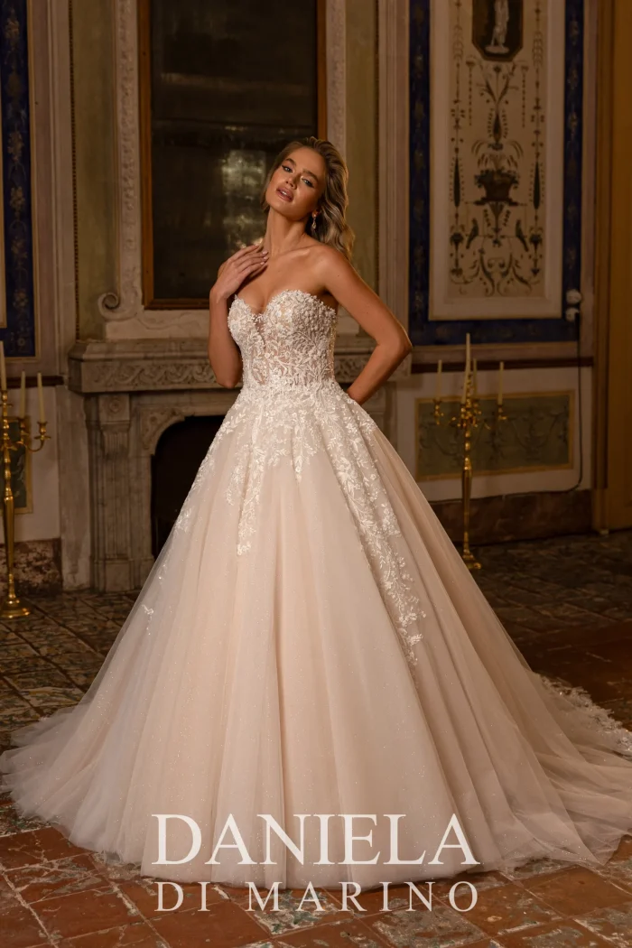 Daniella di Marino a princess gown with lace tulle skirt and glitter,in ivory.