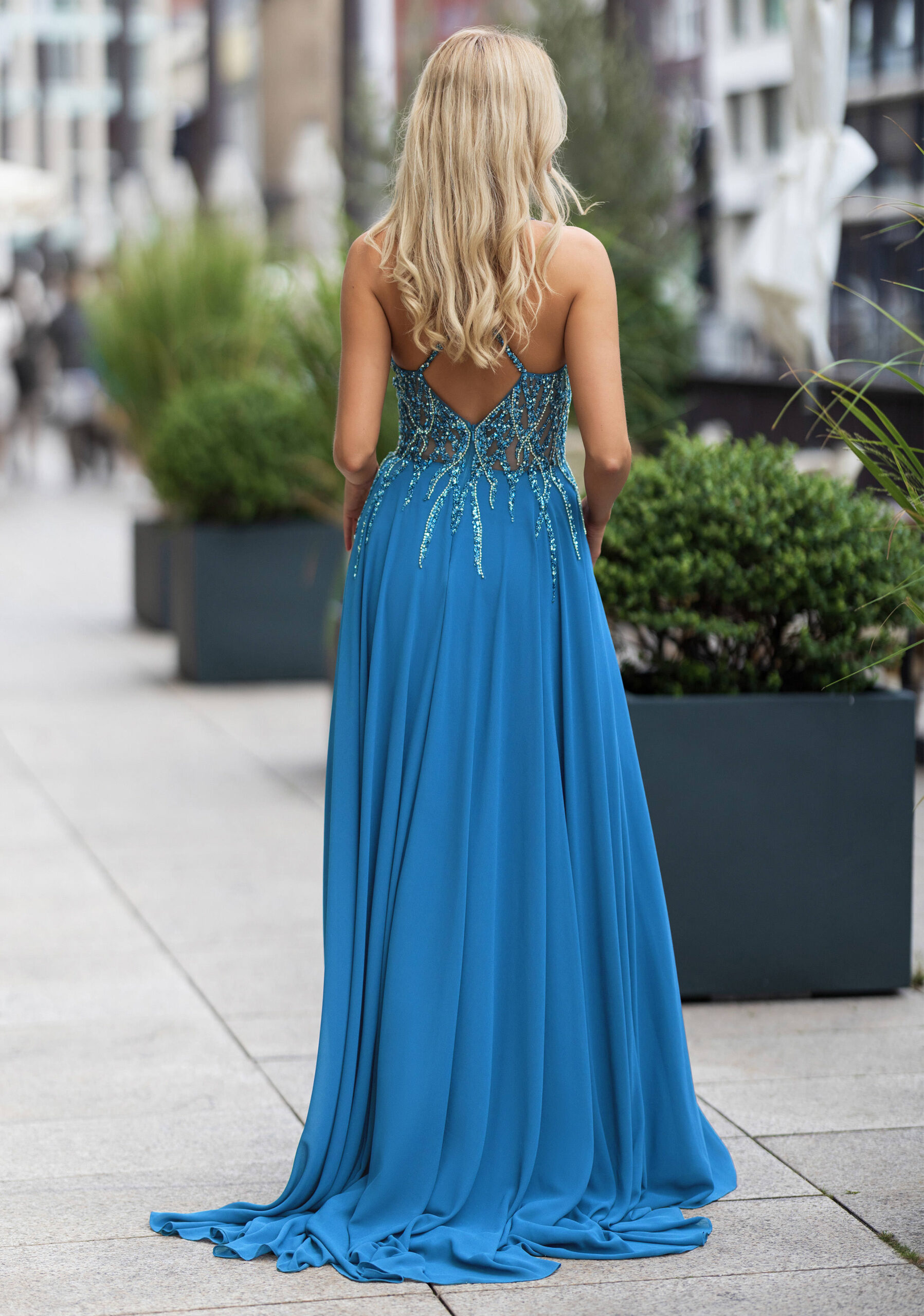 a beautiful evening dress with a v neckline and a chiffon skirt