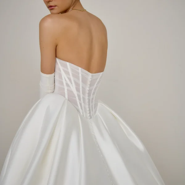 is an Haute couture dress with an Aristocratic style ,Mikado ball gown with sheer tulle bodice and exposed boning.