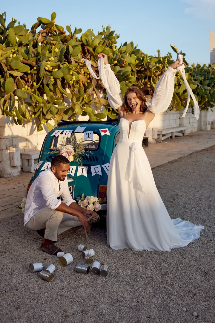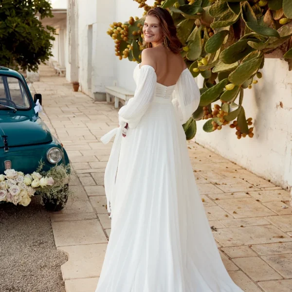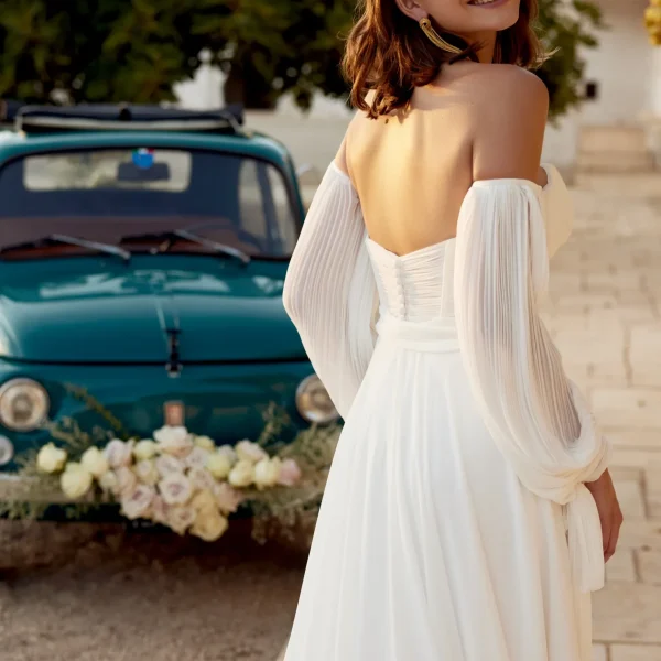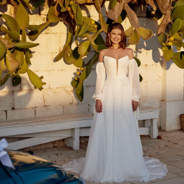 Captivating in a deep V neckline wedding dress, featuring a plisse bodice adorned with a chffon belt with wingsleeves , flowing into a full chiffon skirt and transparent cut out.