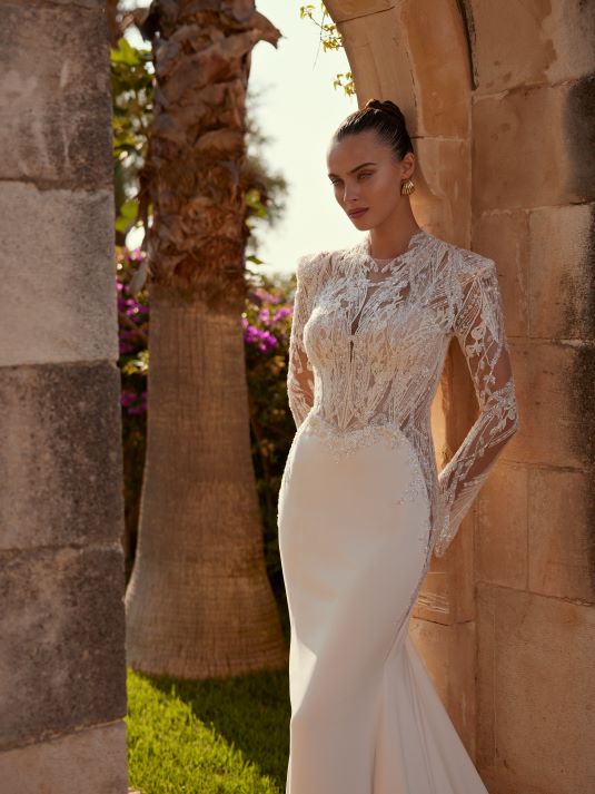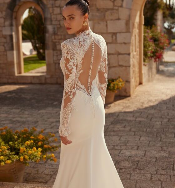 this mesmerizing fit and flare gown designed to captivate with its understated elegance and modern charm. The bodice is delicately adorned with intricate lace and shimmering sequins, adding a touch of sparkle to this look. The see-through lace sleeves provide a subtle yet enchanting touch. The illusion back adorned with a row of buttons adds a hint of drama and sophistication to this gown.