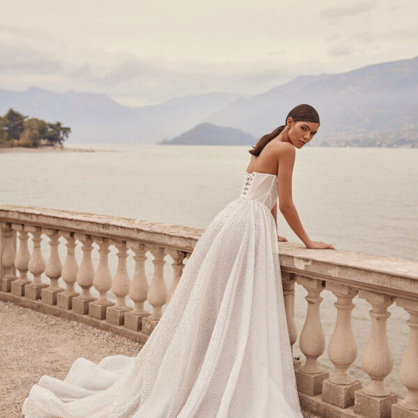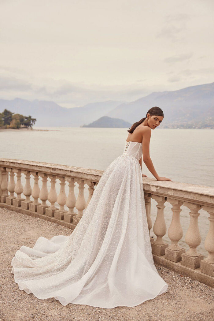 A Stunning sweetheart neckline transparent cut out wedding dress, featuring a full glitter body, flowing into a full tulle Split glitter skirt and a lovely lace up back .