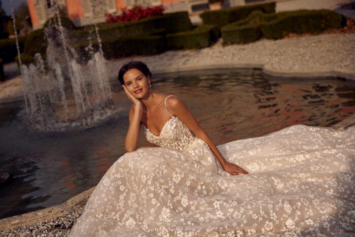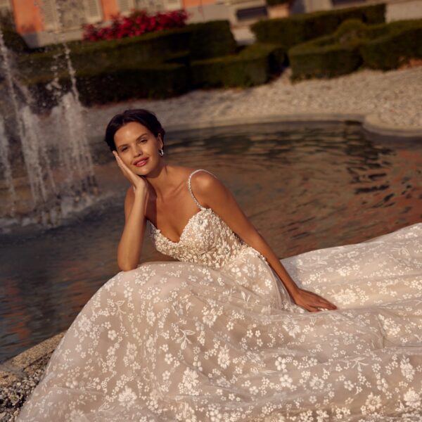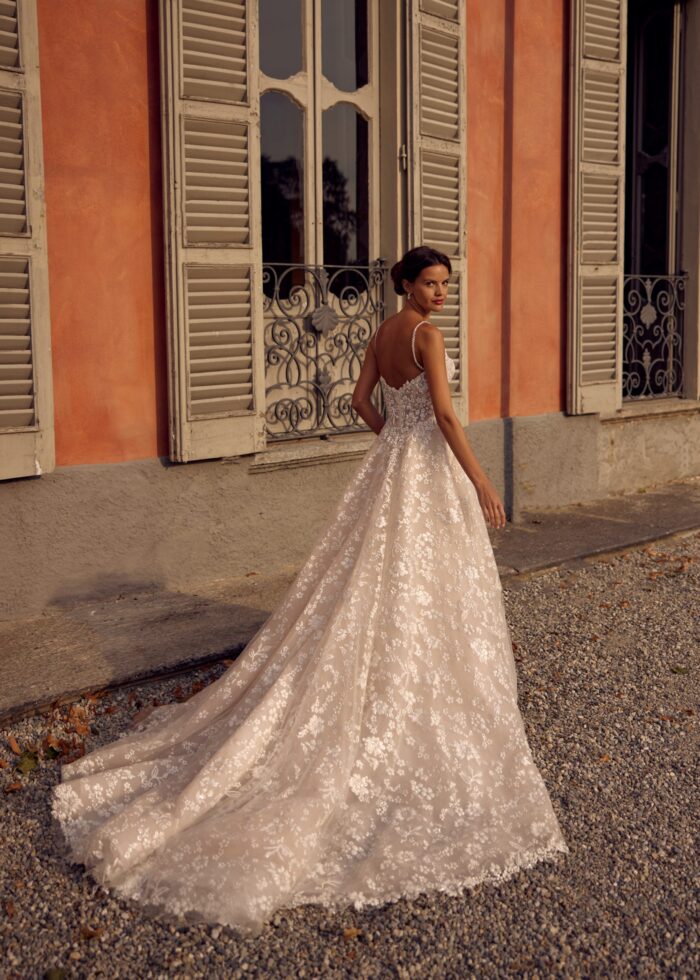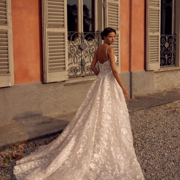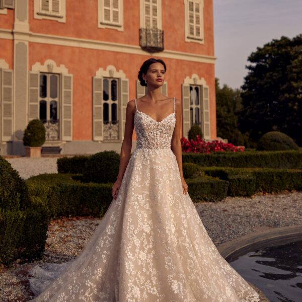 English net 3D lace appliques A-Line Gown with Plunging Sweetheart Neckline with side sleeves .