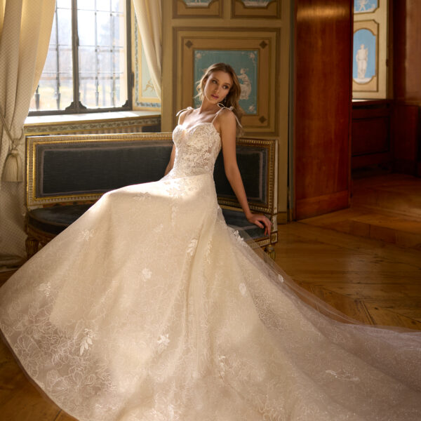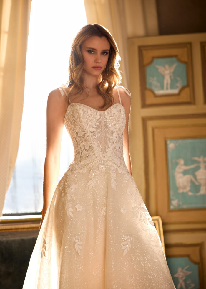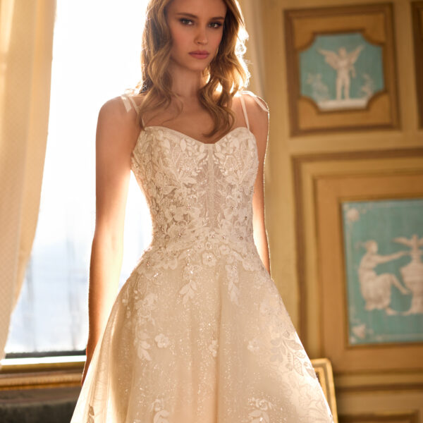 English net 3D lace appliques A-Line Gown with Plunging Sweetheart Neckline with spaghetti straps .